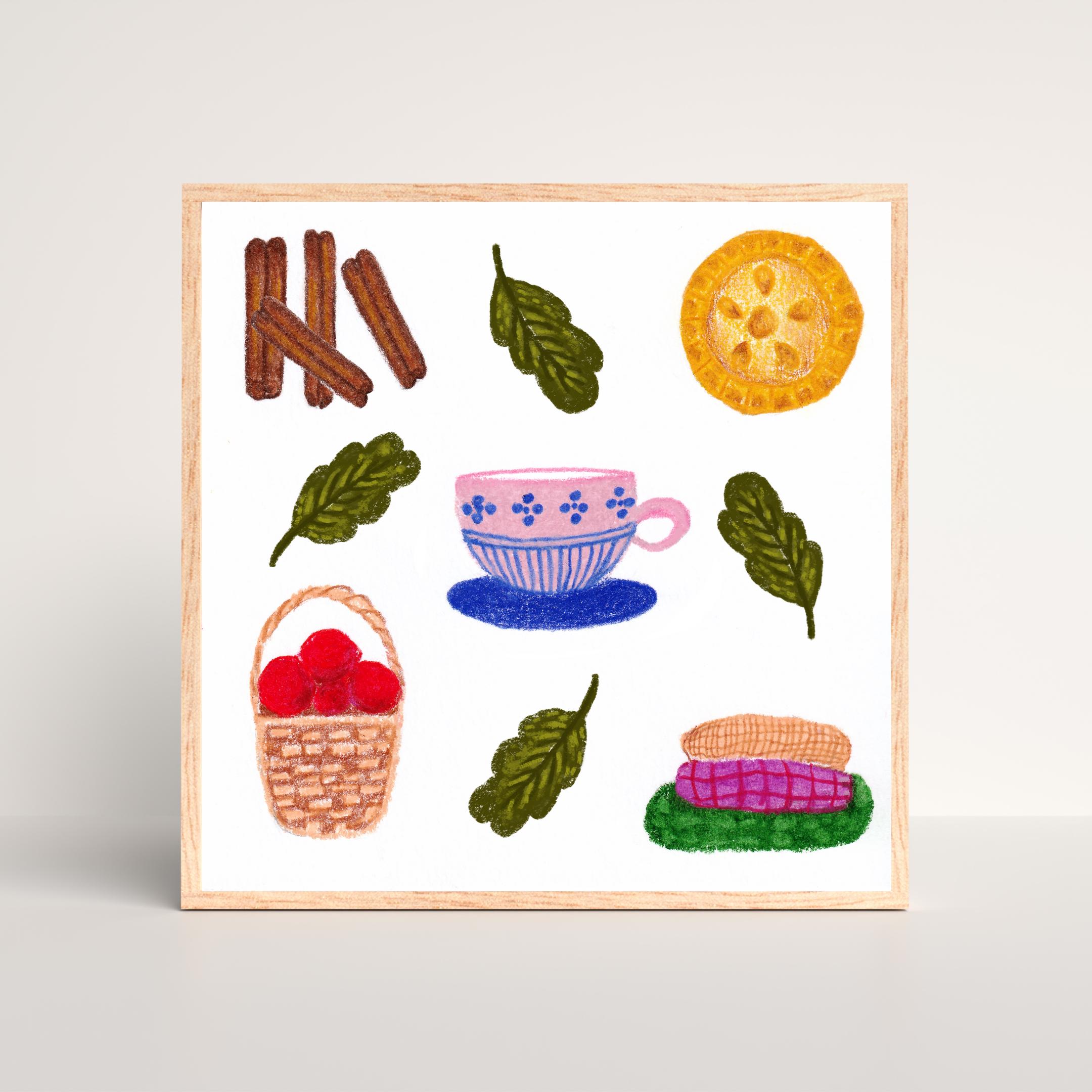 Embrace the warmth and coziness of autumn with this giclée art print featuring a bountiful apple basket, a steaming cup of tea, a freshly baked apple pie, and fragrant cinnamon sticks. The rich, earthy tones and textured details, created with oil pastels, capture the essence of the fall harvest season making it a perfect house warming gift. Display it in your home to enhance your dinner room decor or to create a welcoming atmosphere that evokes the comfort and flavors of autumn. Perfect Gift for Fall Lovers! Each meticulously crafted giclée art print in our collection is designed to infuse your space with the charm of autumn. Whether you choose one or curate a gallery wall, these pieces are sure to evoke the feelings of crisp air, comforting scents, and the vibrant beauty of fall in your decor. Transform your surroundings into a haven of autumnal delight with these evocative artworks.