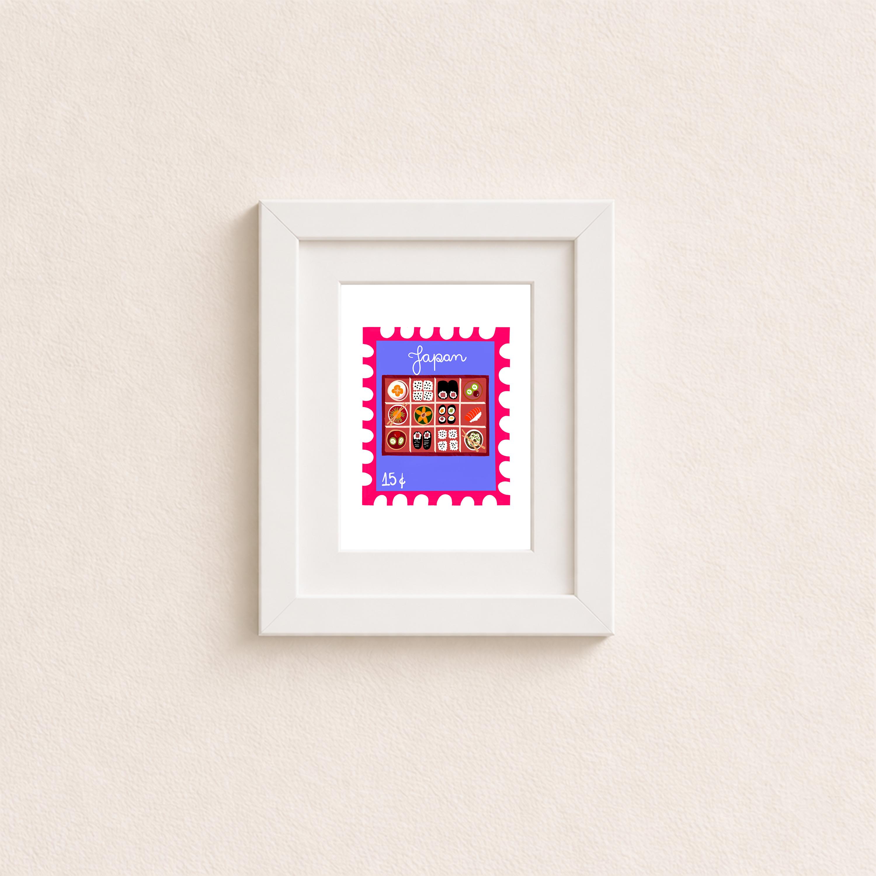 Elevate your decor with the charming appeal of Japan’s culinary artistry captured on this vintage stamp art print. The detailed depiction of a traditional bento box brings cultural elegance and a touch of authenticity to any room. Ideal for collectors or as a thoughtful gift for food and art lovers.