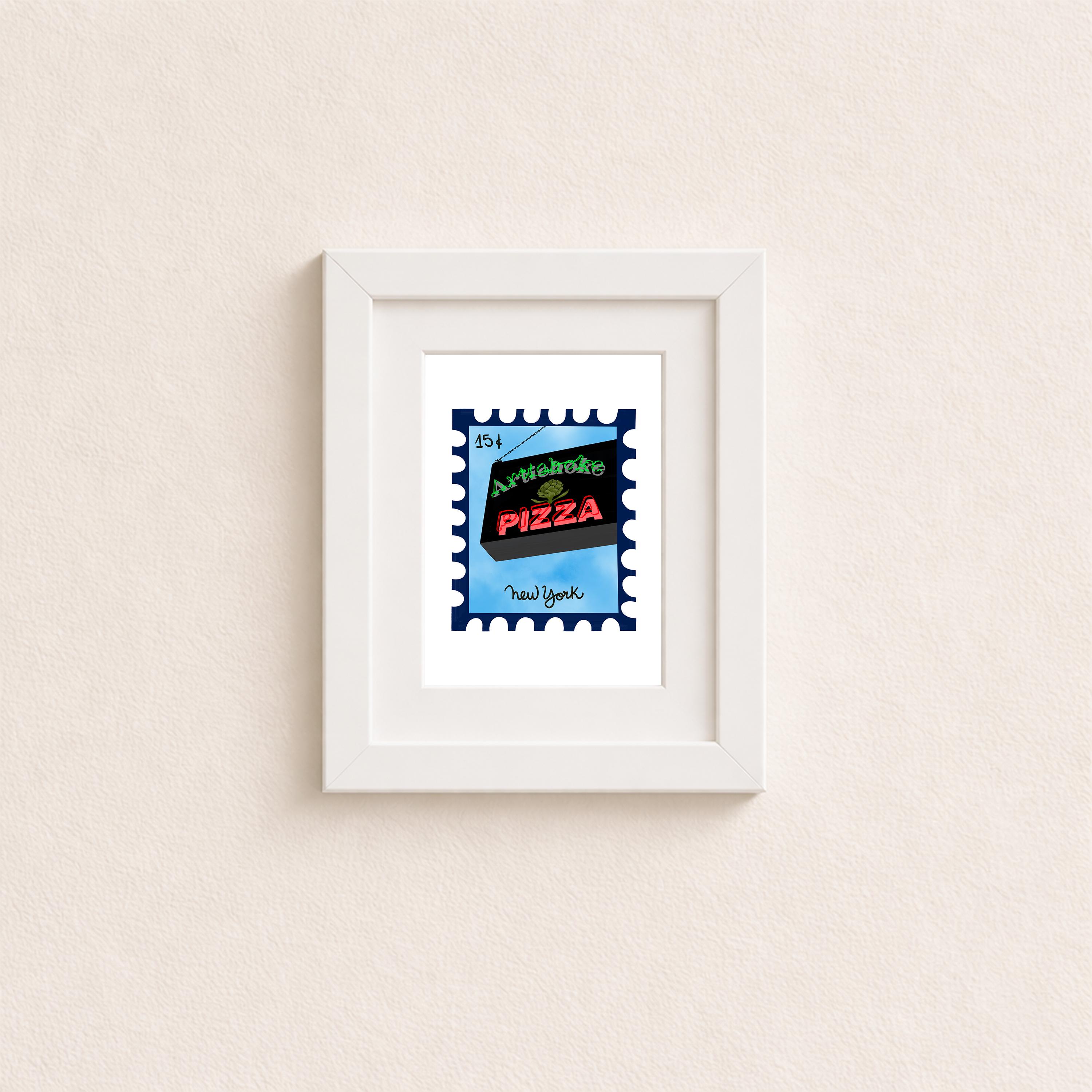 Celebrate the unique flavors of New York City with this vintage stamp art print featuring an artichoke pizza design. This distinctive print captures the vibrant culinary scene and urban charm of NYC, adding a quirky twist to your decor. Perfect for foodies, art collectors, and those who love city culture.