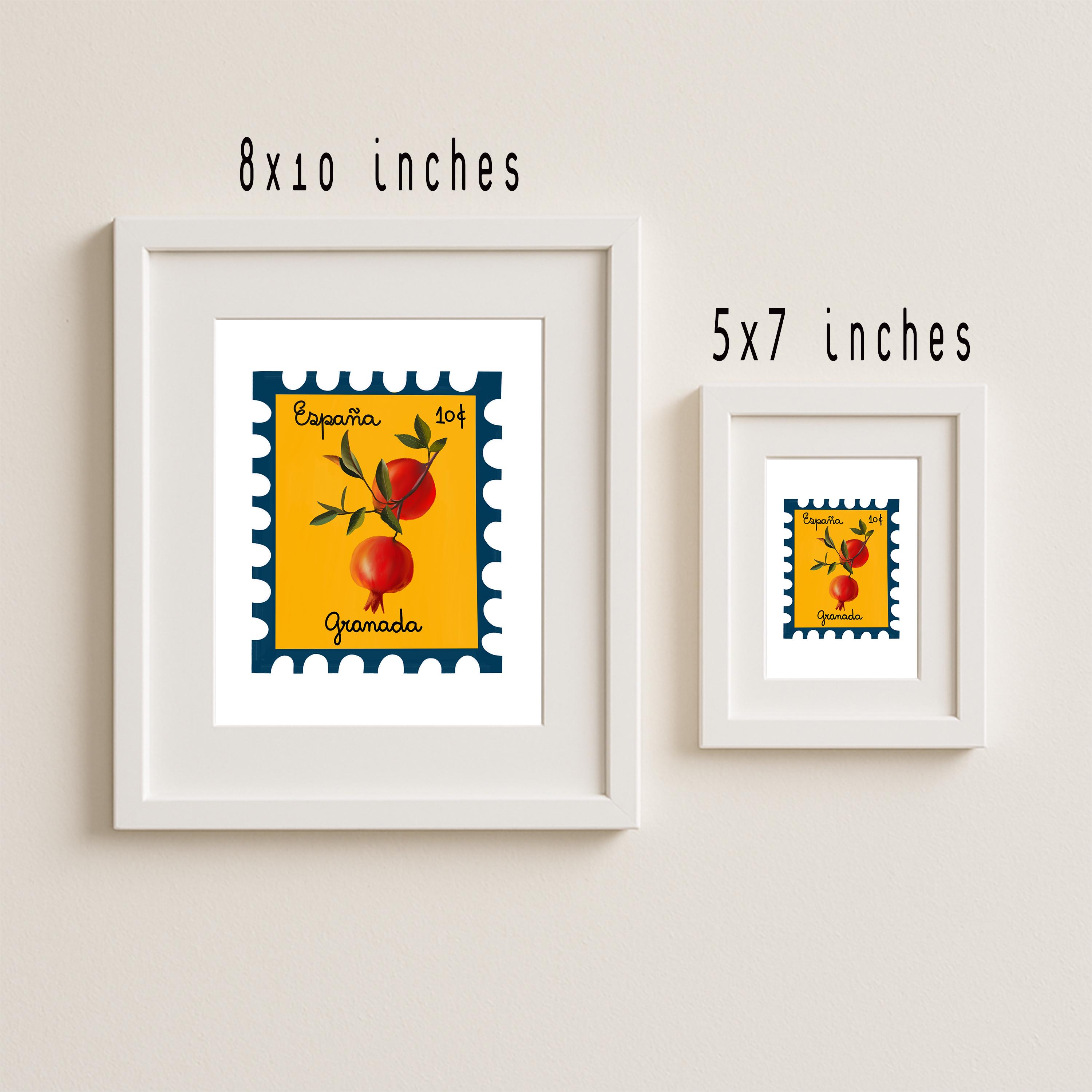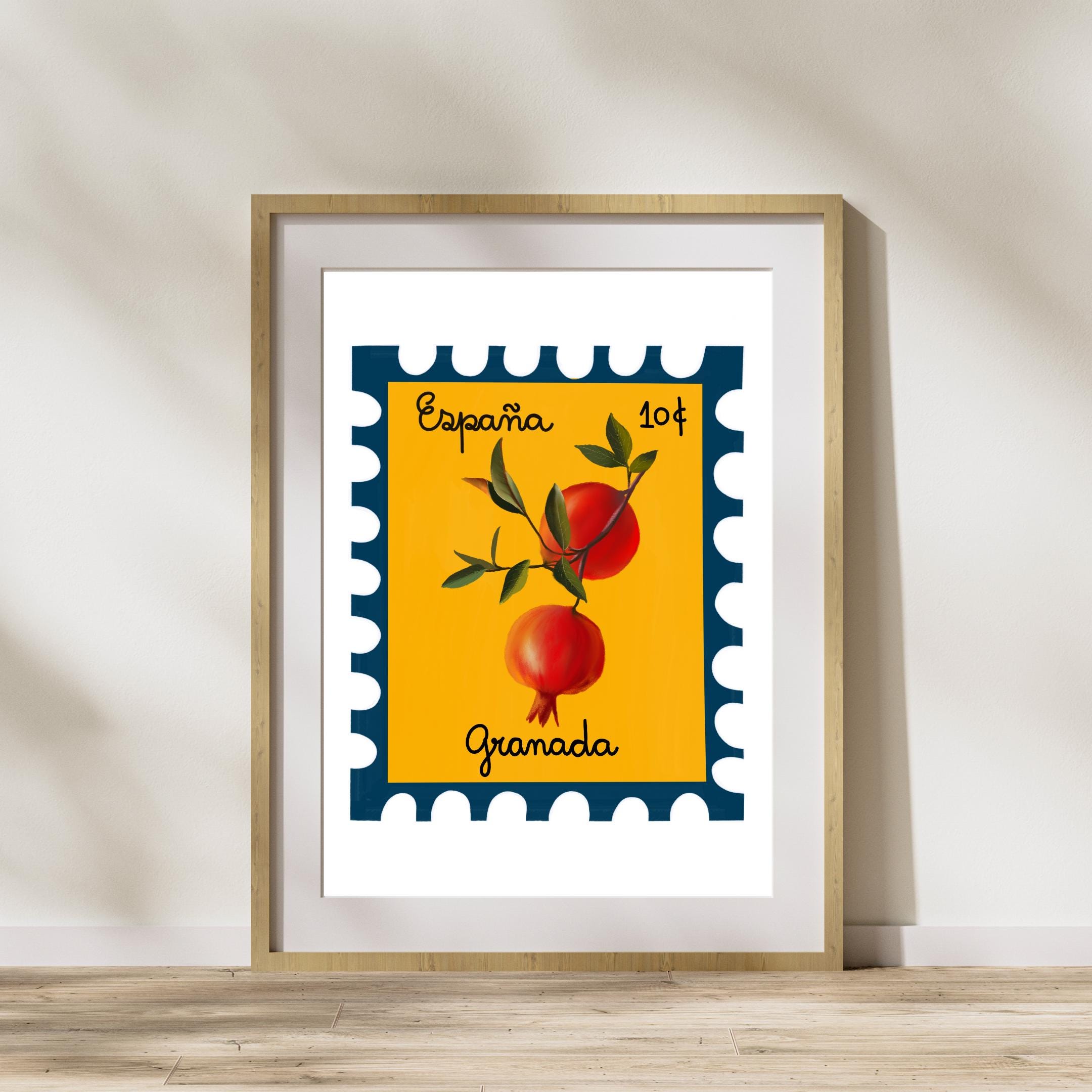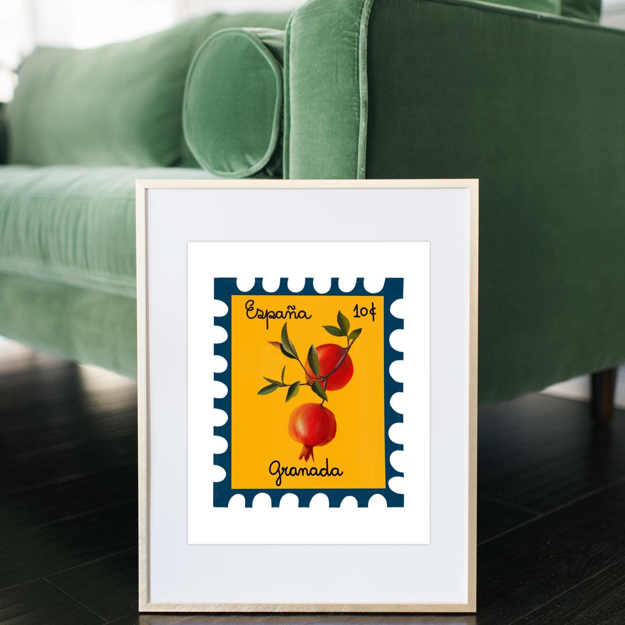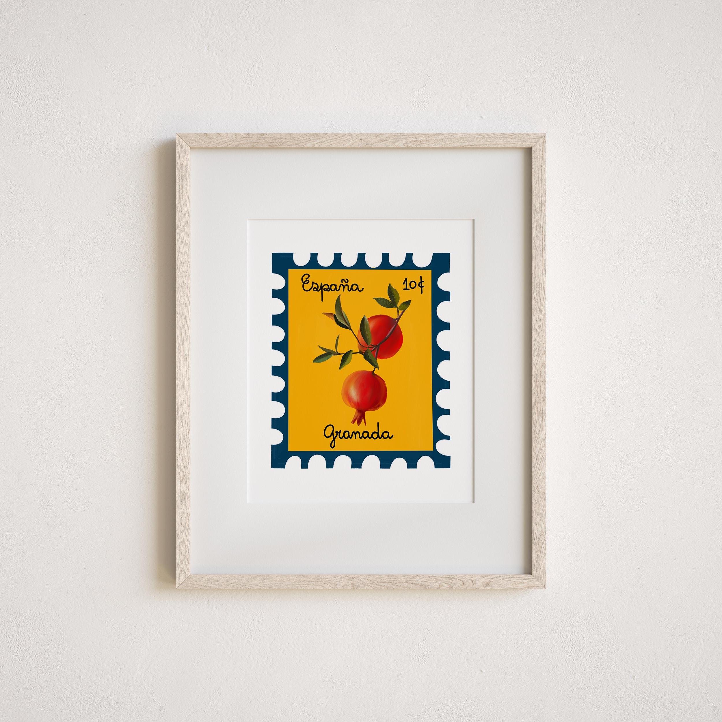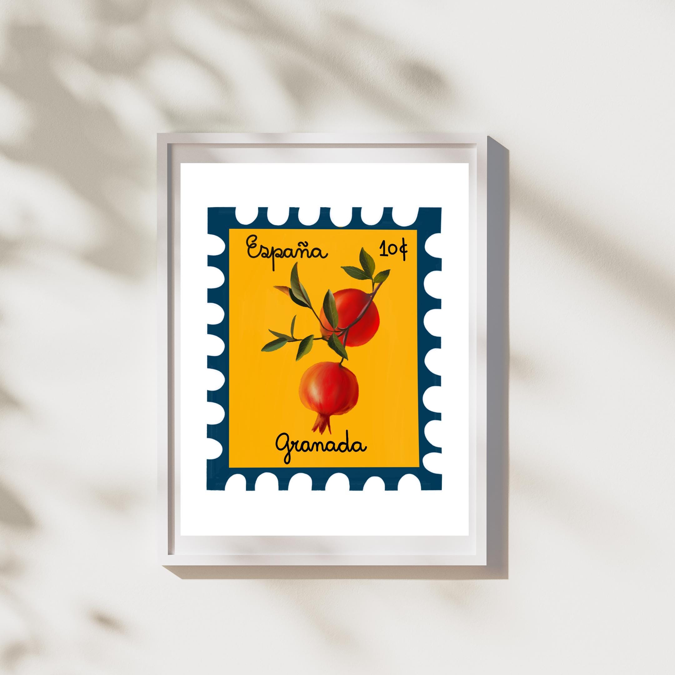 Step into a world of nostalgia with this vintage stamp art print inspired by Spain’s rich heritage and vibrant nature. Featuring a digital illustration of pomegranates, colored with soft pencil textures, the piece celebrates abundance, beauty, and the Mediterranean spirit. A perfect addition to kitchens, studios, or any space craving warmth and timeless charm, it’s a tribute to life’s sweetness and color.