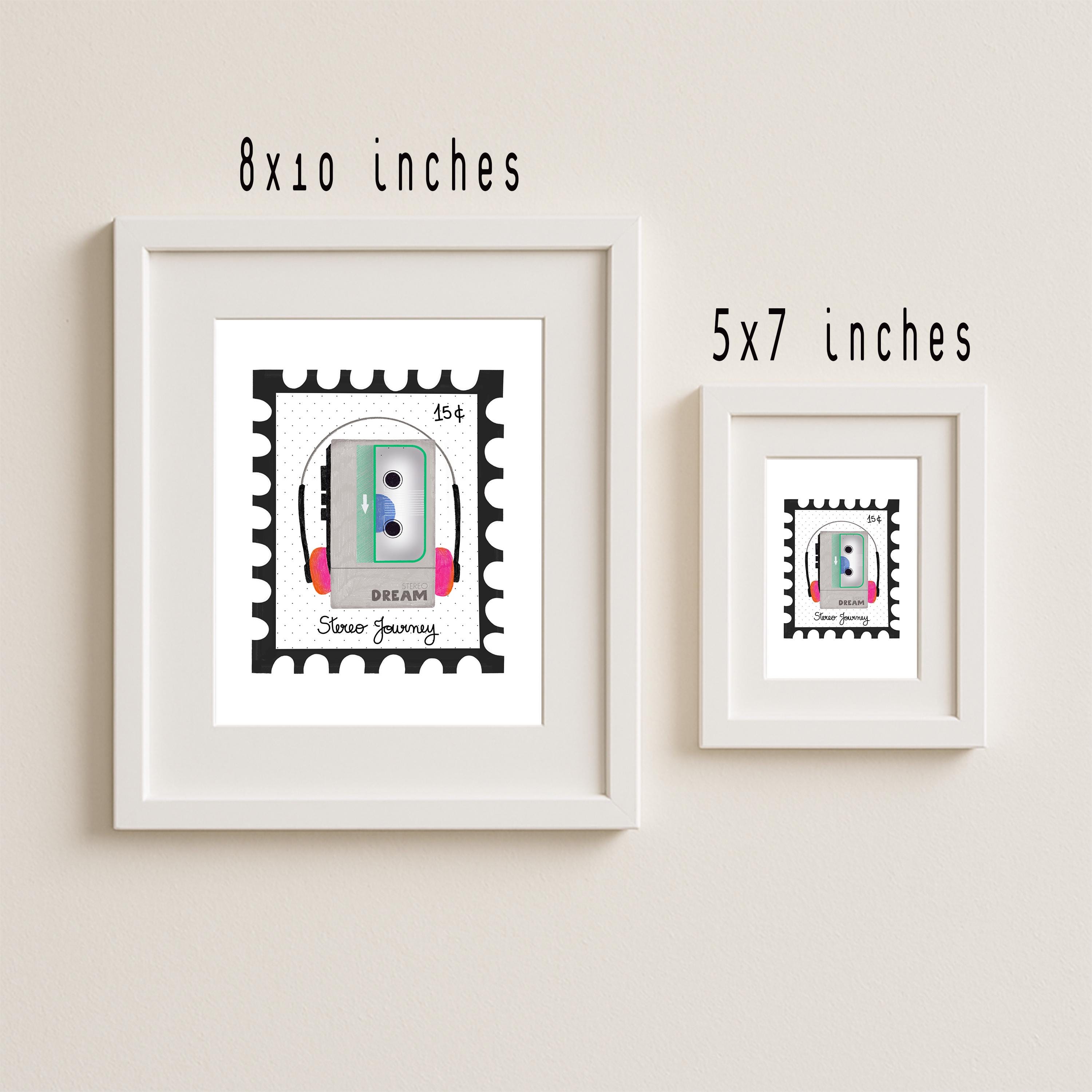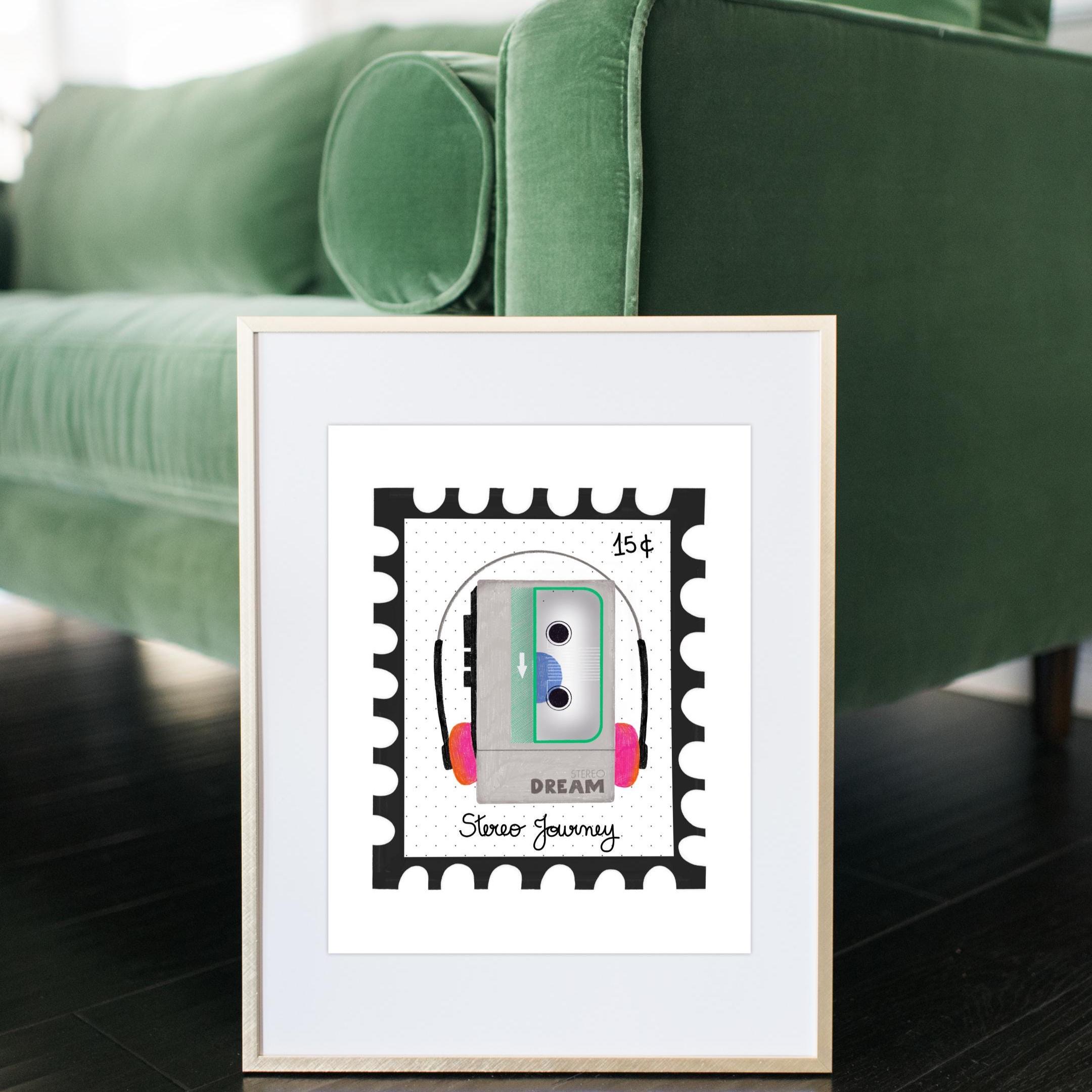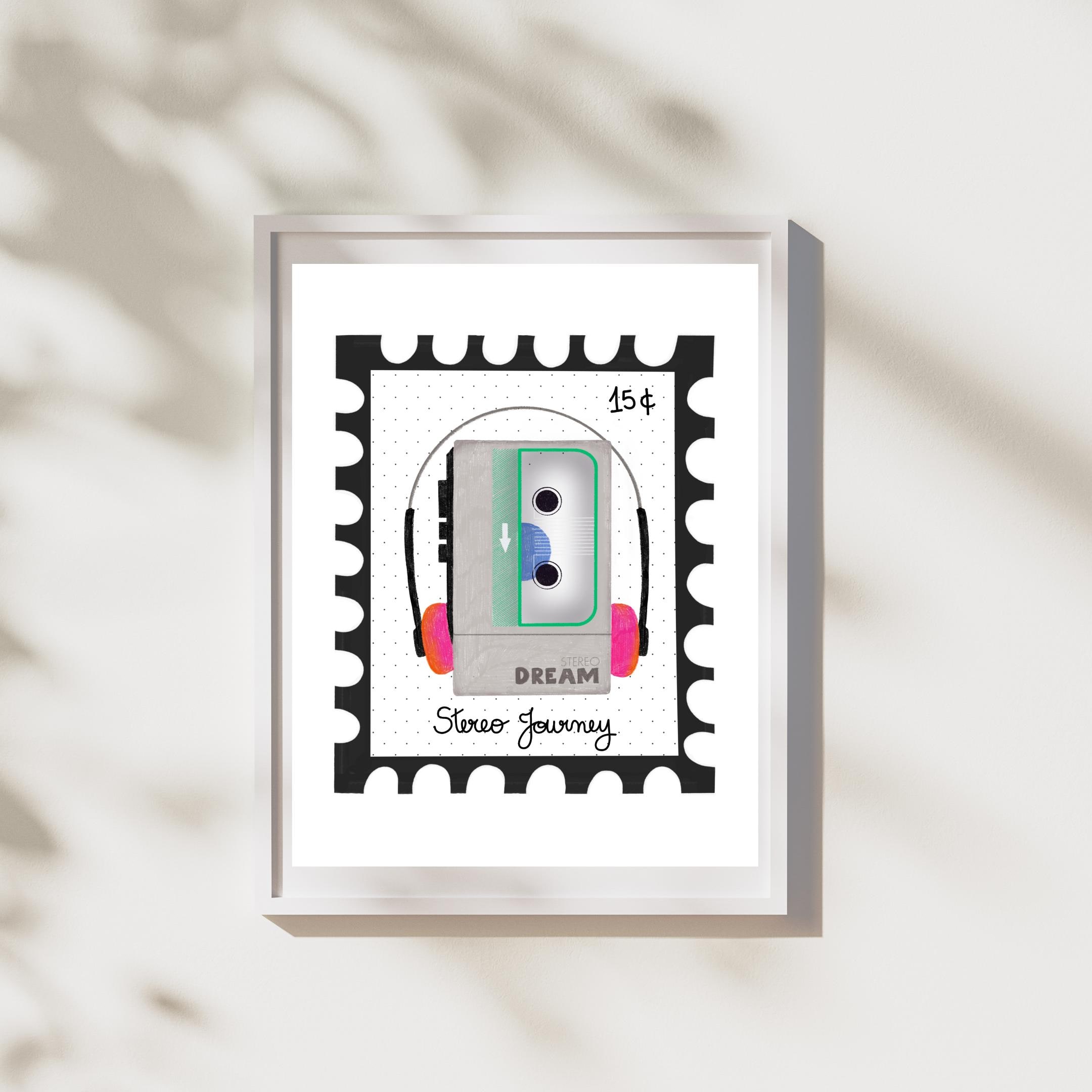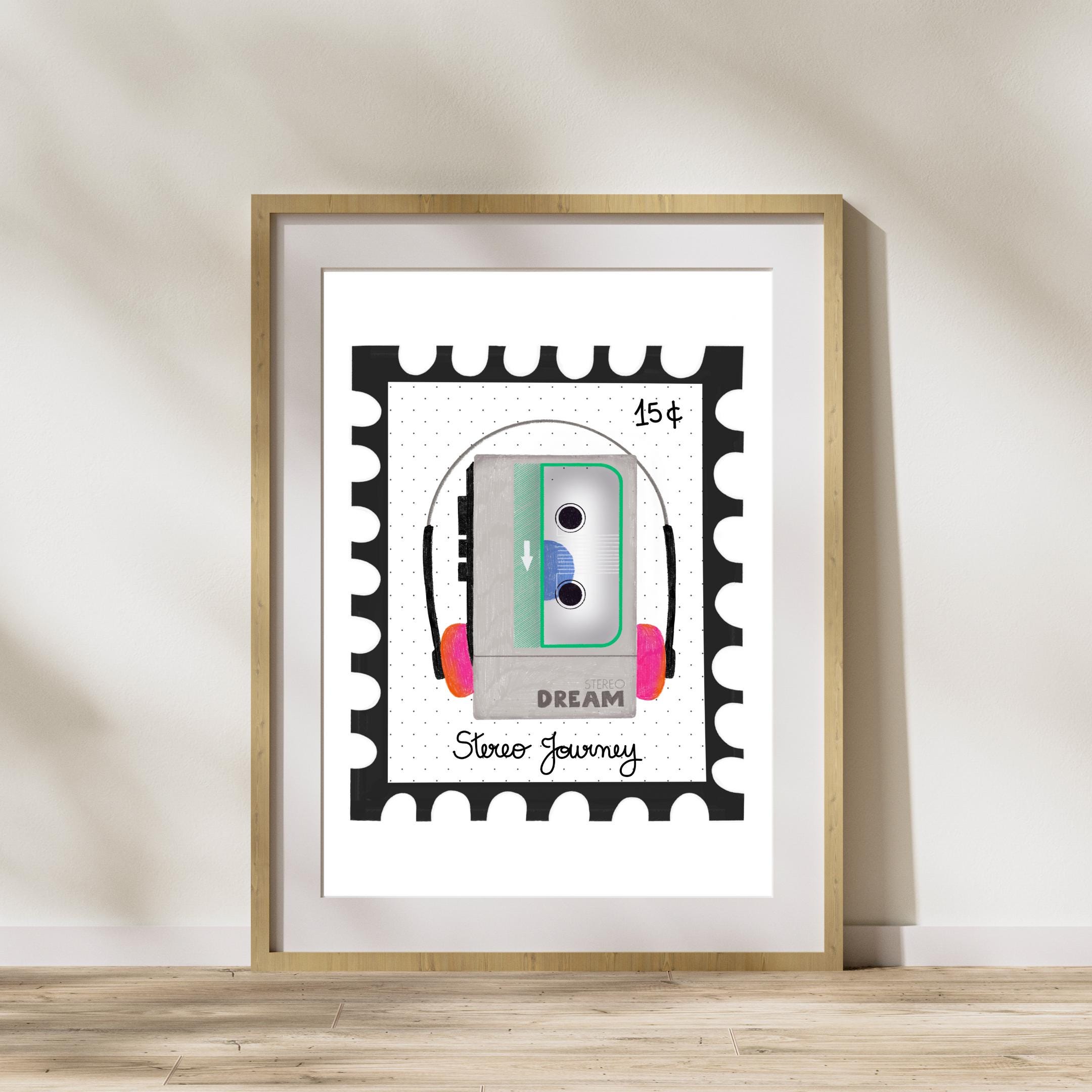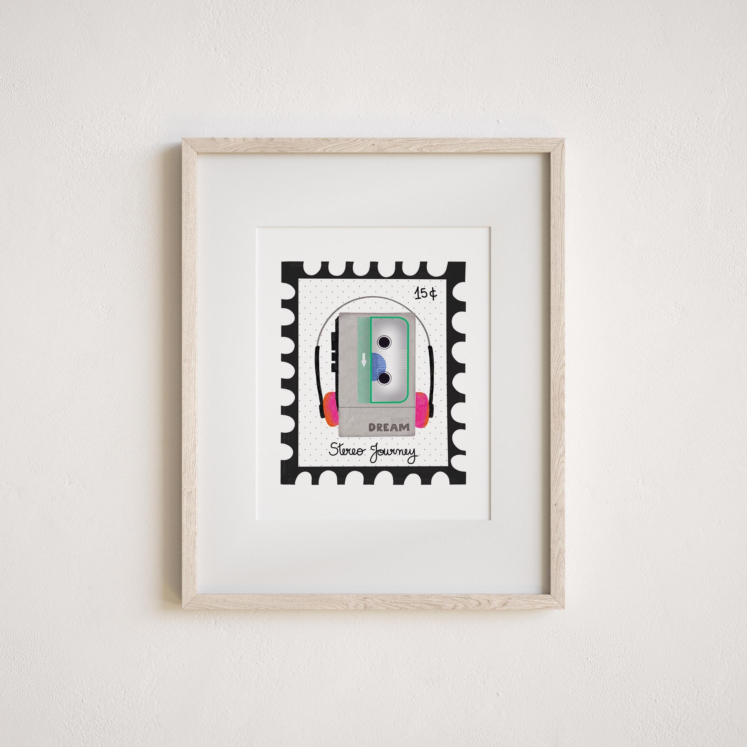 Step into a world of nostalgia with this vintage stamp art print titled “Stereo Journey.” Featuring a digital illustration colored with colored pencil of a classic walkman, the design pays tribute to the golden age of mixtapes and endless playlists. A must-have for music lovers and retro collectors, it captures the pure joy of pressing play and getting lost in sound.