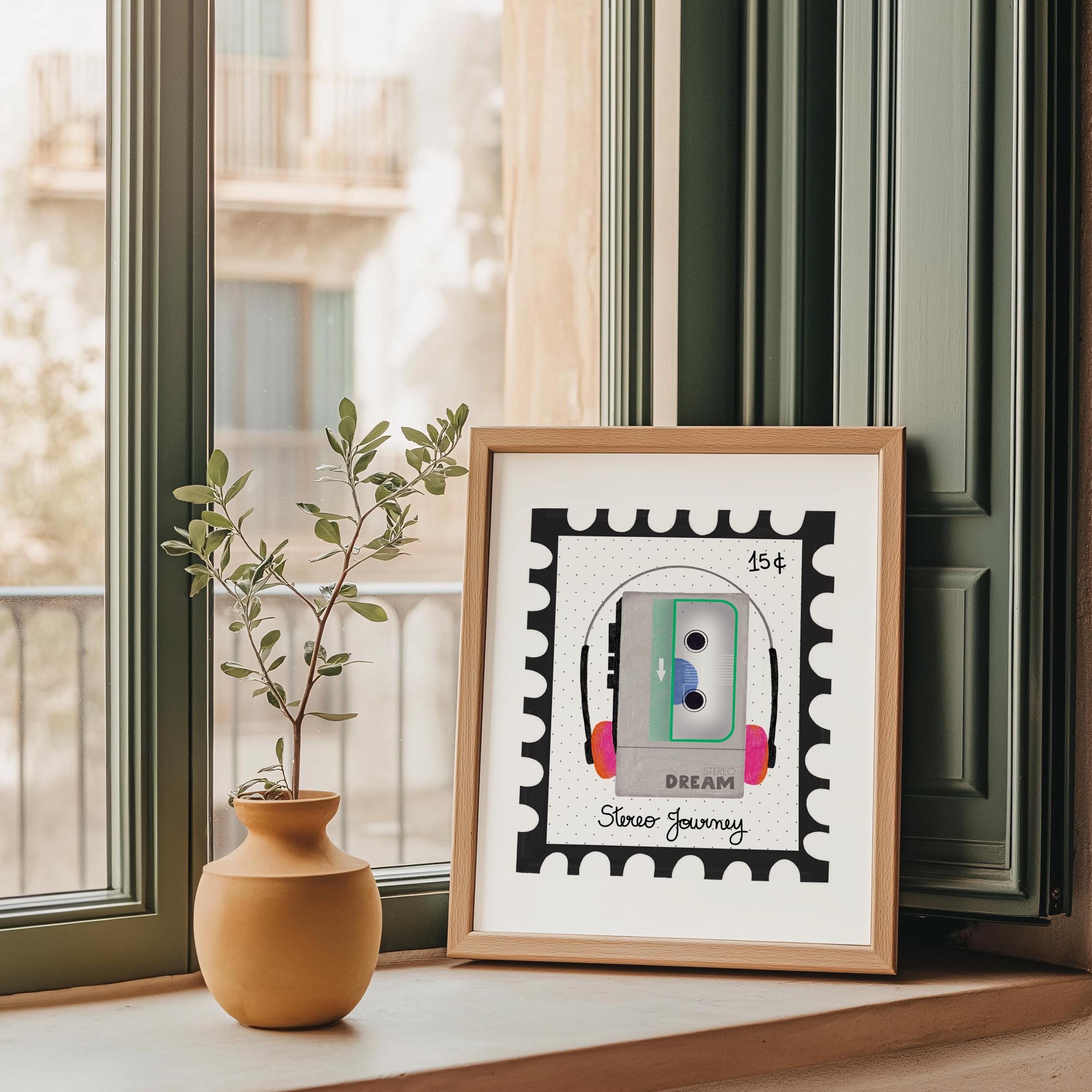 Step into a world of nostalgia with this vintage stamp art print titled “Stereo Journey.” Featuring a digital illustration colored with colored pencil of a classic walkman, the design pays tribute to the golden age of mixtapes and endless playlists. A must-have for music lovers and retro collectors, it captures the pure joy of pressing play and getting lost in sound.