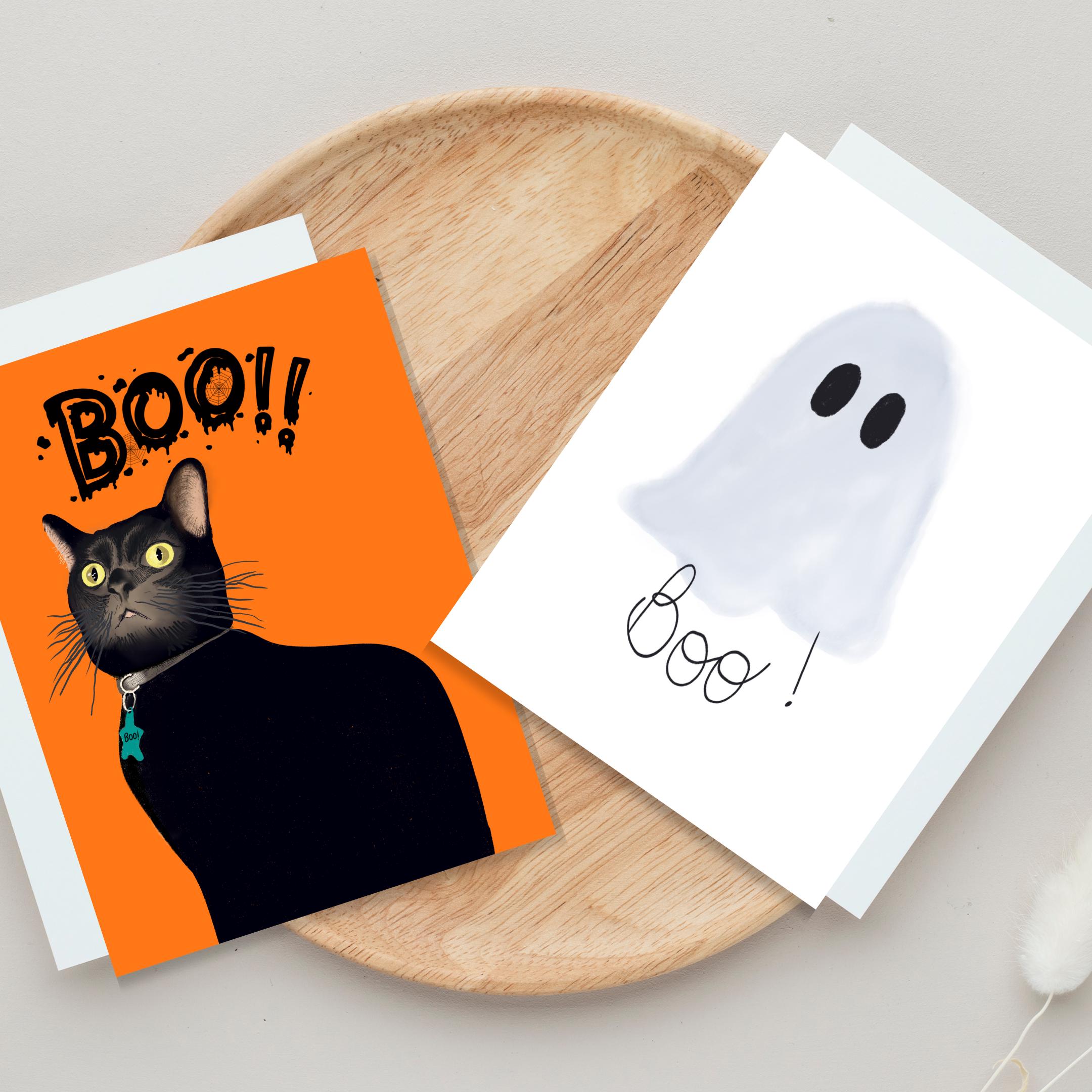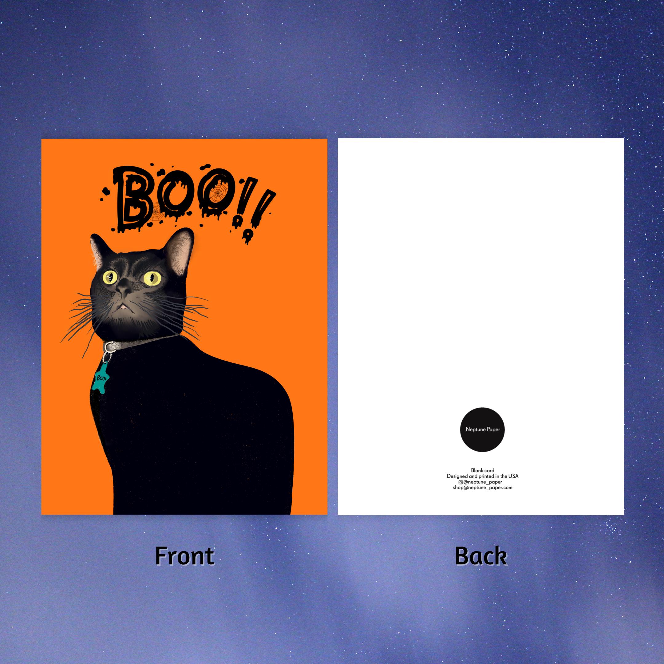 Step into spooky season with this playful Halloween card featuring a curious black cat under bold “Boo!!” lettering. Illustrated with charm and a touch of mischief, it’s the perfect mix of cute and eerie — ideal for cat lovers, Halloween fans, or anyone who appreciates a good seasonal scare with a wink.