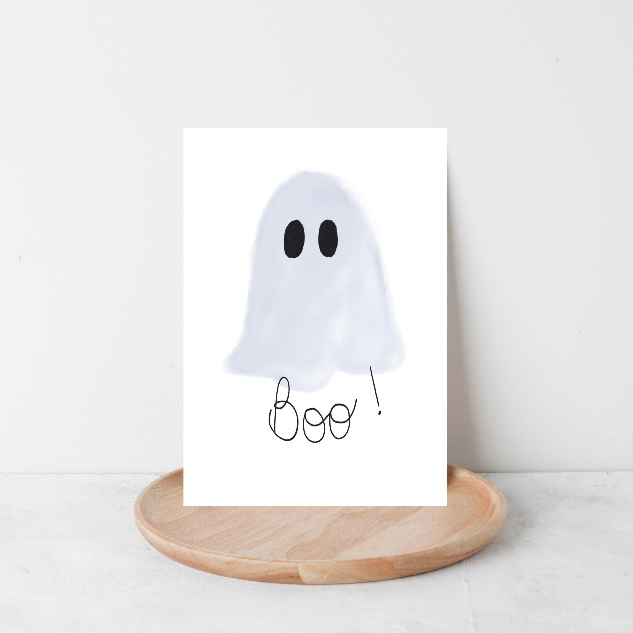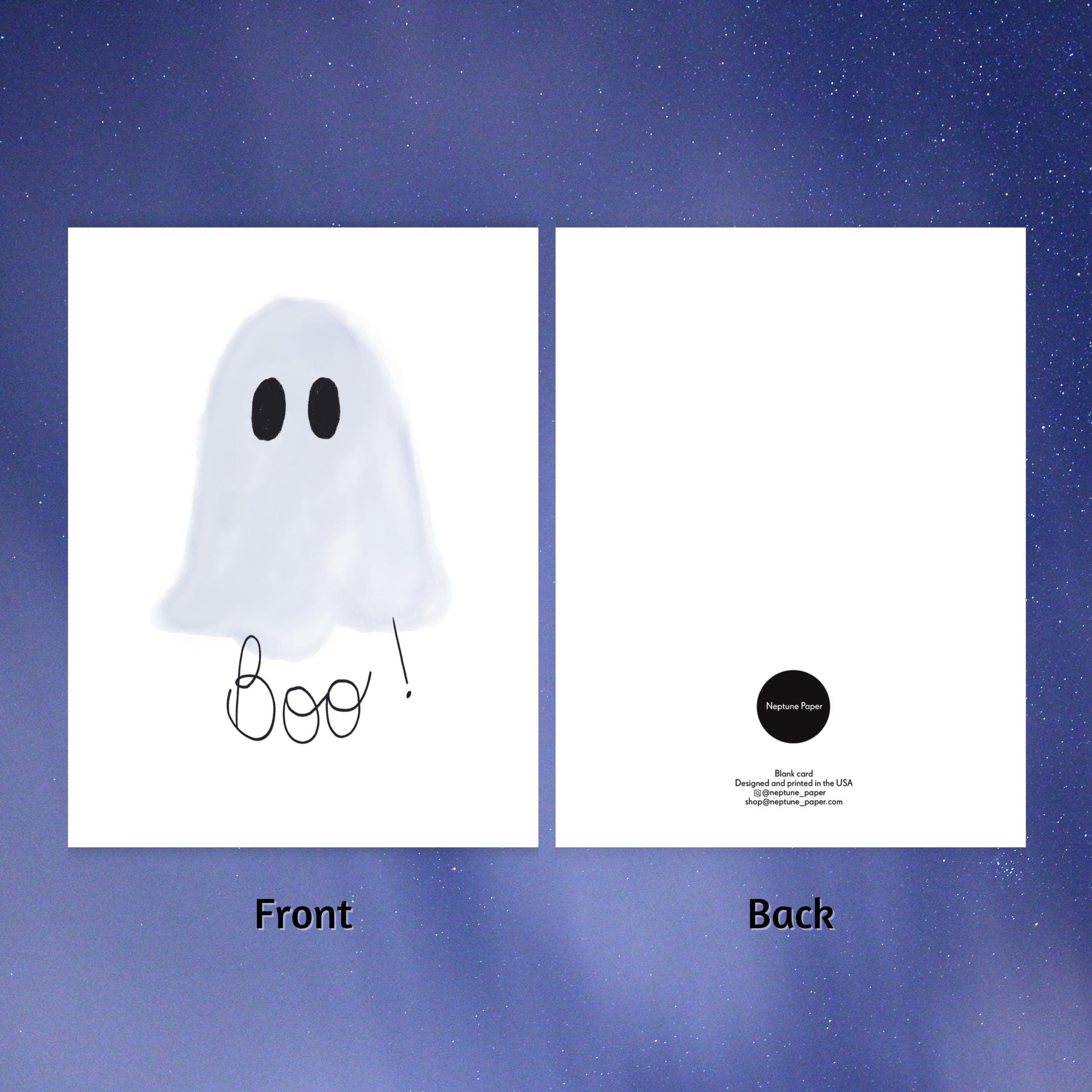 This charming Halloween card features a soft digital illustration of a sweet little ghost saying “Boo!” — a perfect balance of spooky and adorable. A lovely way to send festive cheer, it’s great for both kids and adults who believe Halloween should come with a smile.