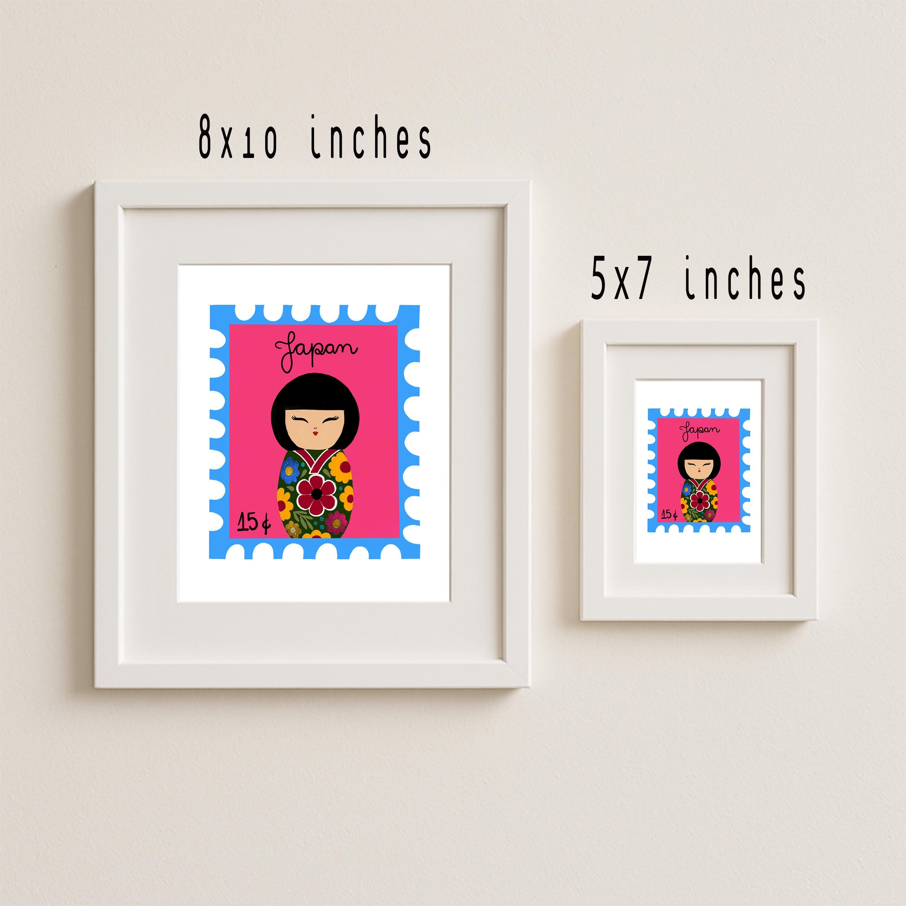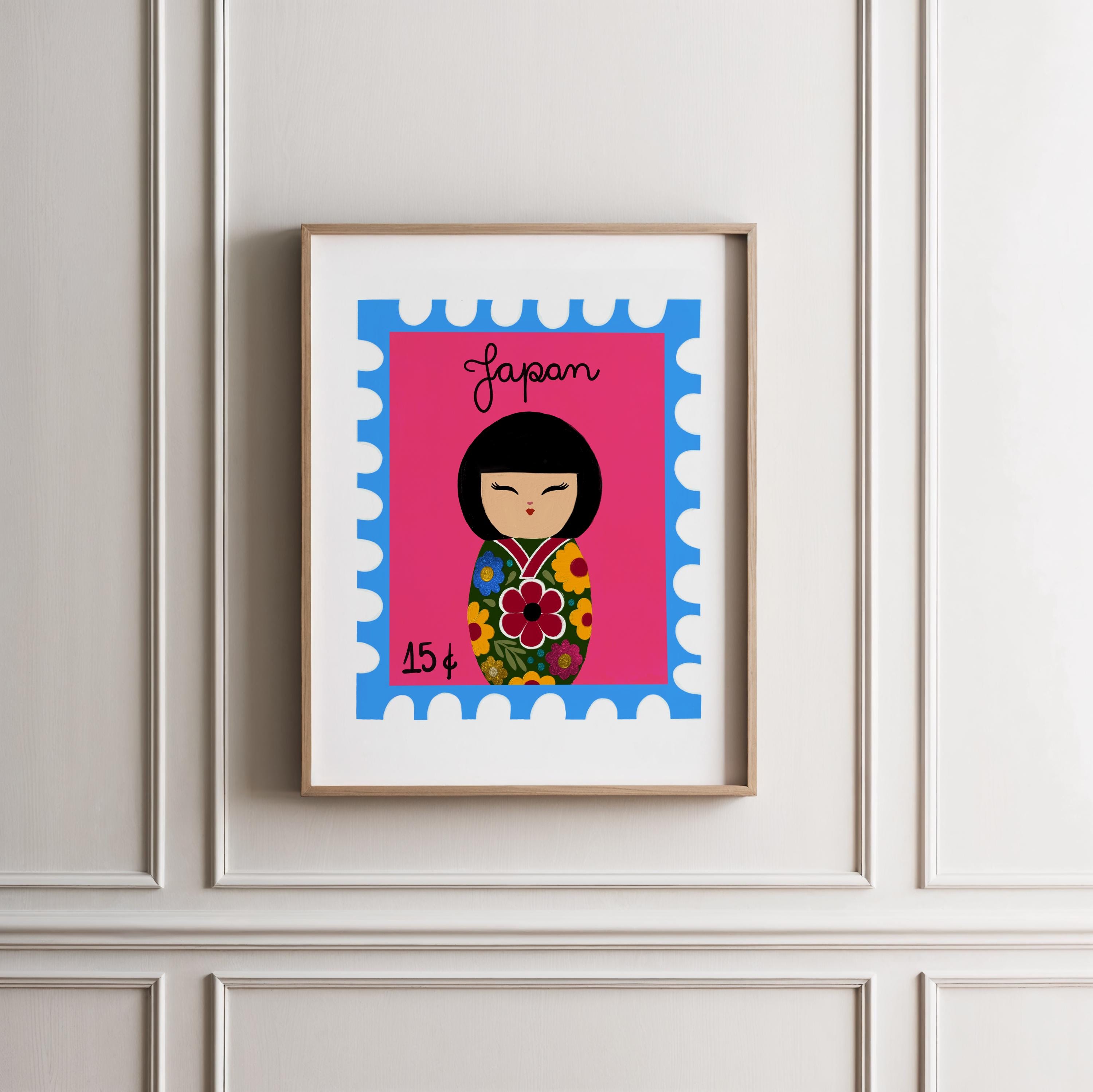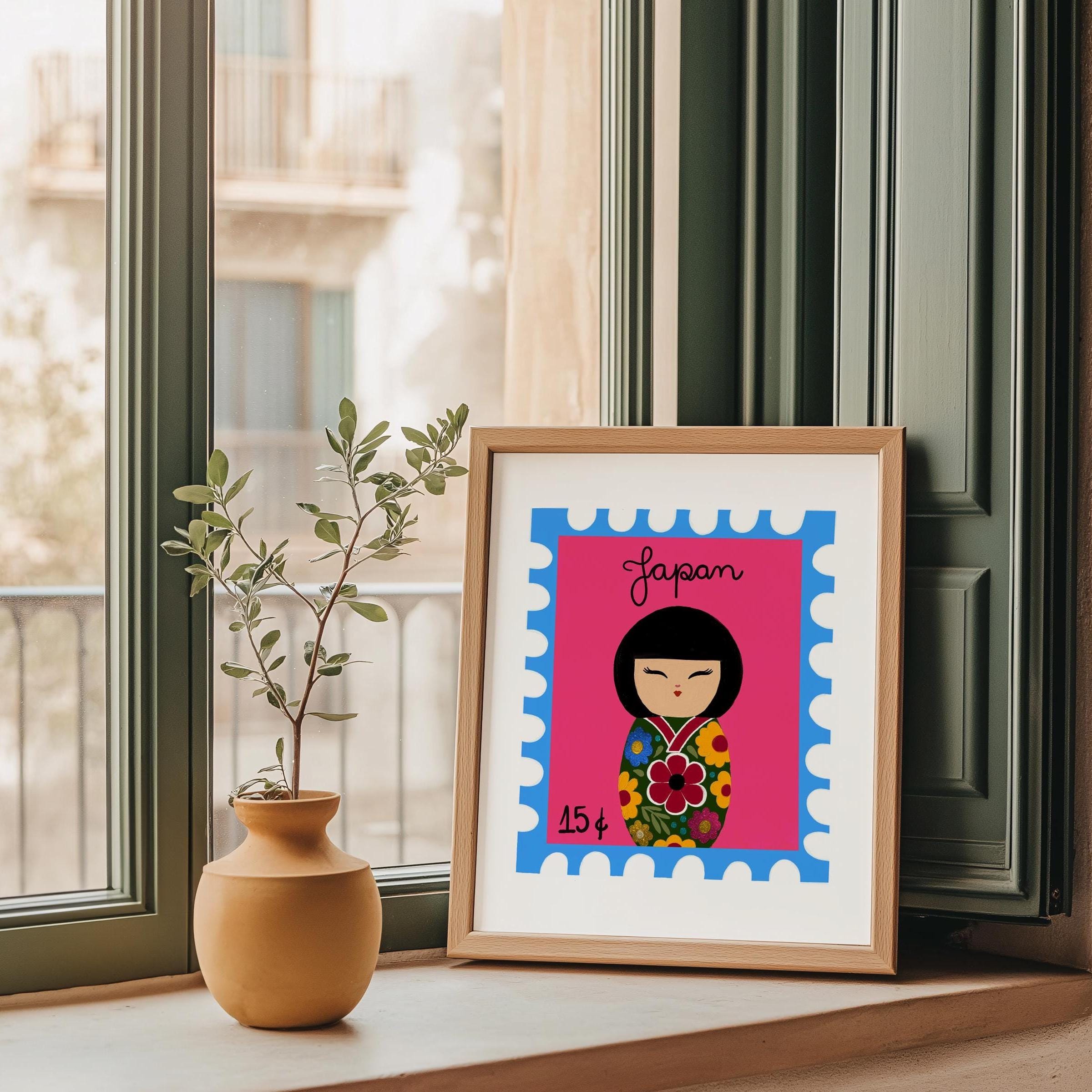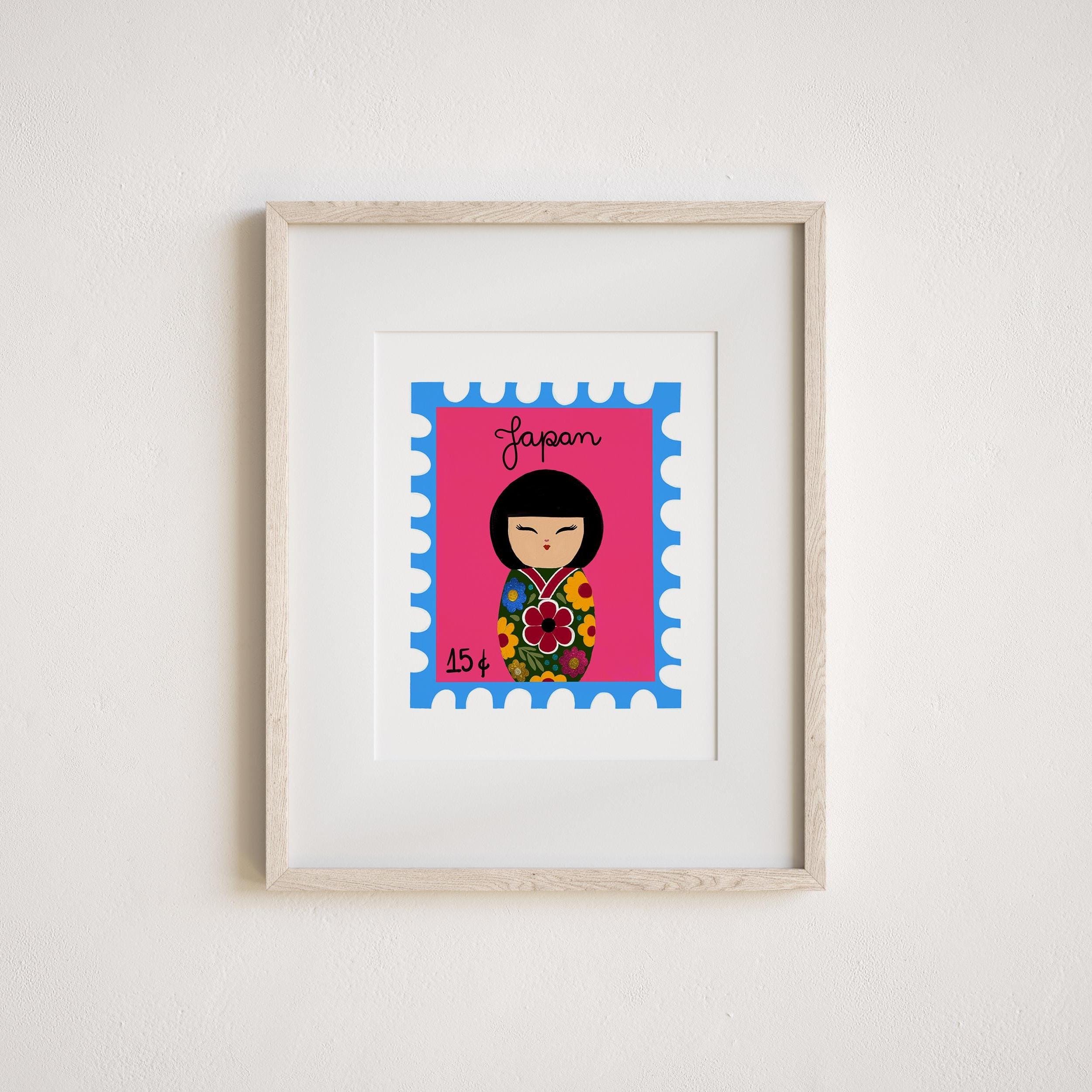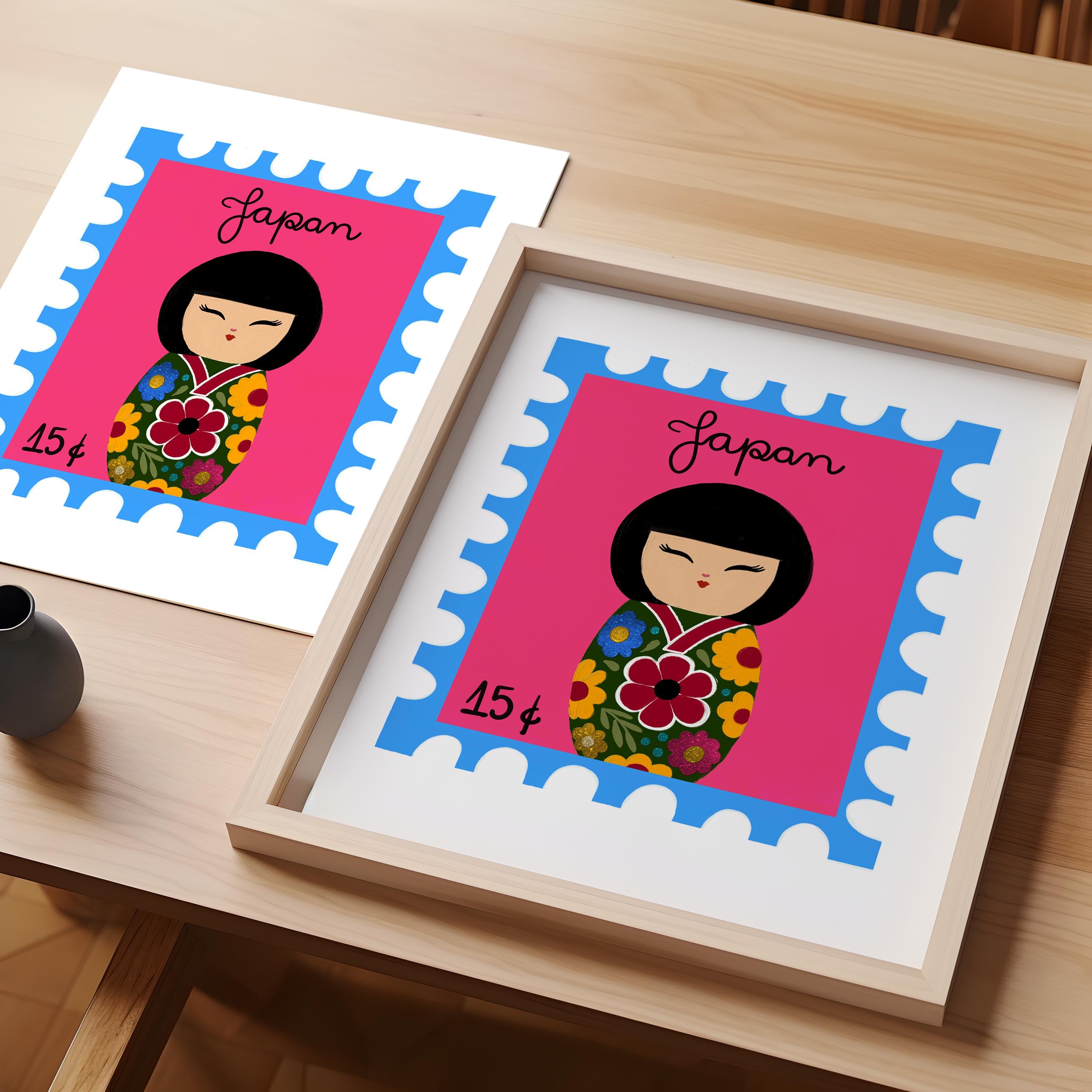 Elevate your decor with the charming appeal of Japan’s culture captured on this vintage stamp Japanese doll art print. The detailed depiction of a traditional Japanese doll brings cultural elegance and a touch of authenticity to any room. Ideal for collectors or as a thoughtful gift for art lovers.